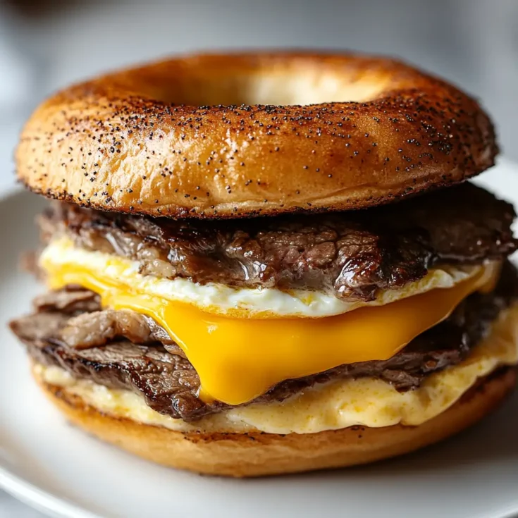 - Assemble: Toast bagels, spread sauce, and layer steak, eggs, and cheese. Serve warm.