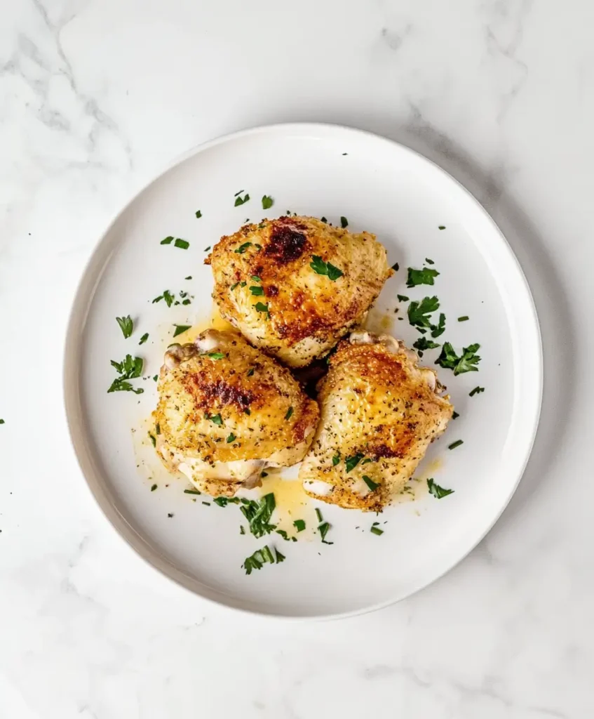 Slide your baking sheet into the preheated oven and bake for 35-40 minutes until the skin is golden brown and crispy, and the internal temperature reaches 165°F (74°C) when measured with a meat thermometer at the thickest part (avoiding the bone). The high temperature creates that mouth-watering crispy exterior while the thighs’ natural fat content keeps the meat juicy and tender.