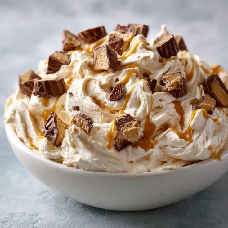 Finally, fold in the 1/2 cup of chopped Reese’s Peanut Butter Cups. This adds delightful chunks of chocolate and peanut butter throughout your fluff.