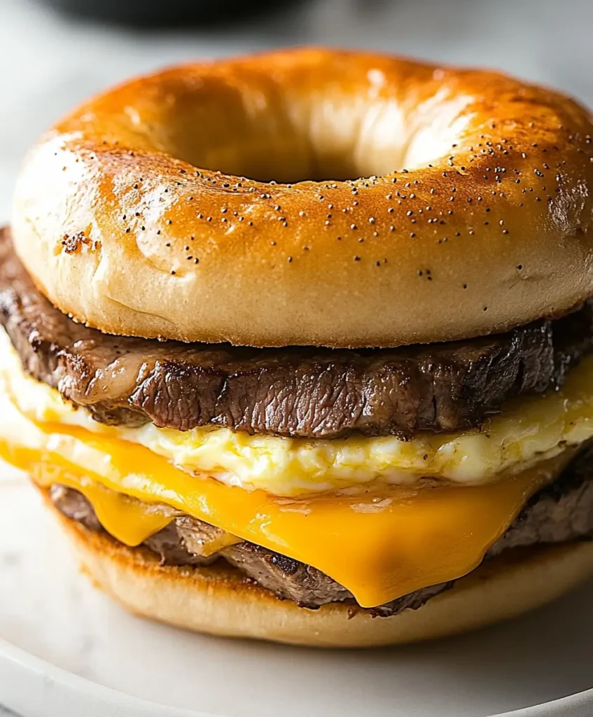 - Assemble: Toast bagels, spread sauce, and layer steak, eggs, and cheese. Serve warm.