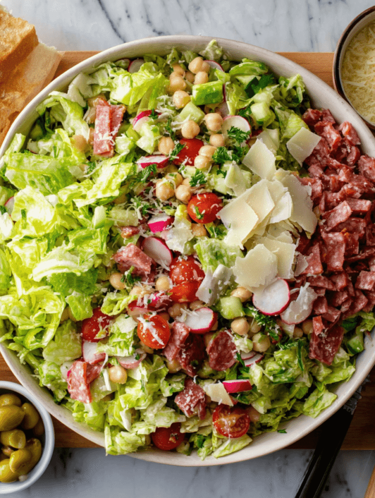 - Chop Vegetables: In a large bowl, combine the chopped romaine lettuce, cherry tomatoes, cucumber, red onion, radishes, garbanzo beans, diced salami, provolone cheese, Kalamata olives, and chopped parsley.