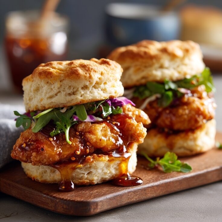 Hot Honey Chicken Biscuit Sandwiches are a deliciously spicy and sweet treat that combines crispy fried chicken with fluffy biscuits and a drizzle of hot honey. Perfect for brunch or a satisfying meal, these sandwiches are sure to impress!