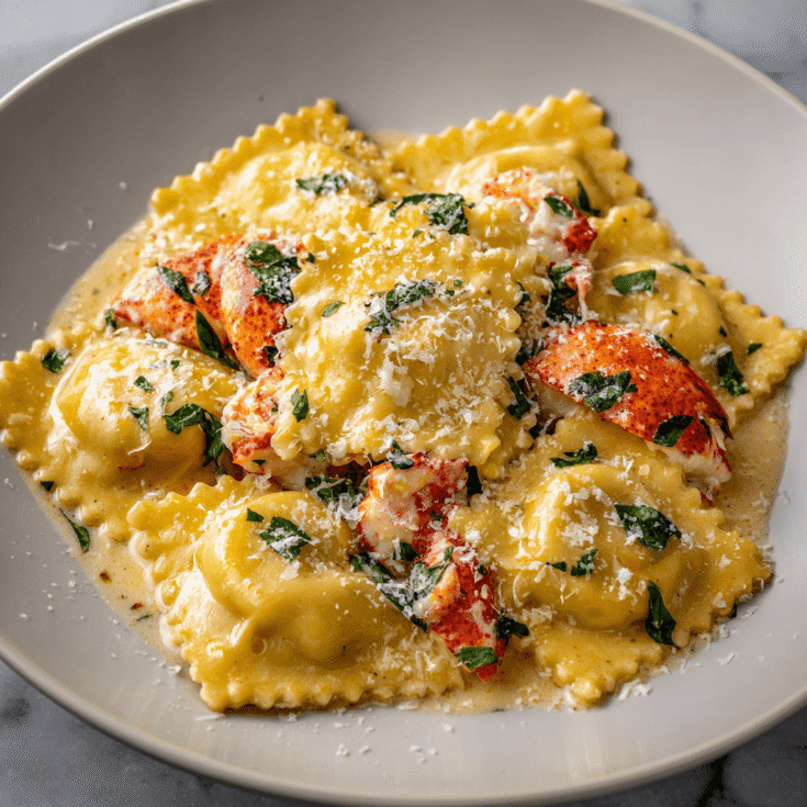 Lobster Ravioli is a luxurious pasta dish filled with fresh lobster meat and served with a rich sauce. This elegant meal is perfect for special occasions or a delightful dinner at home, showcasing the delicate flavors of lobster.