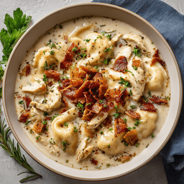 Creamy Pierogi Chicken Soup with Rosemary Bacon Bits Recipe